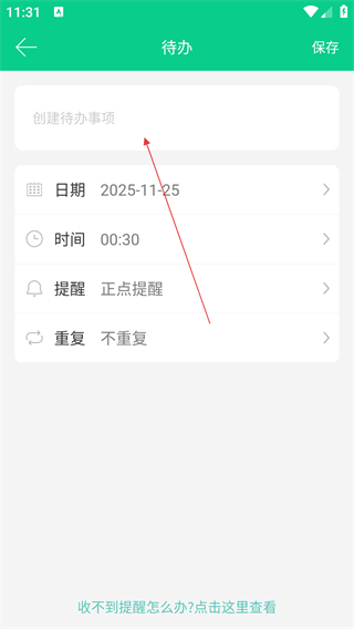 3、在待辦界面中,輸入待辦事項內容,并設置日期、時間等參數,完成后點擊【保存】。