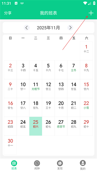 1、在“我的班表”頁面,點擊右上角的“+”按鈕,彈出功能選擇菜單。
