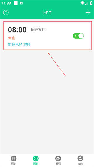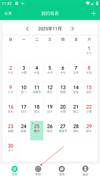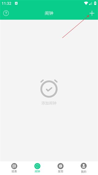 1、在“我的班表”頁面,點擊底部【鬧鐘】選項,進入鬧鐘功能頁面。