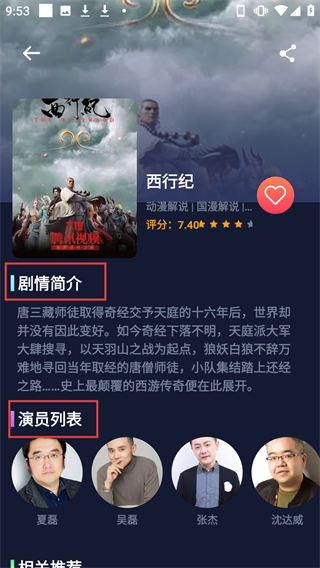 4、在《西行紀》的詳情頁面,可查看【劇情簡介】【演員列表】等相關內容。
