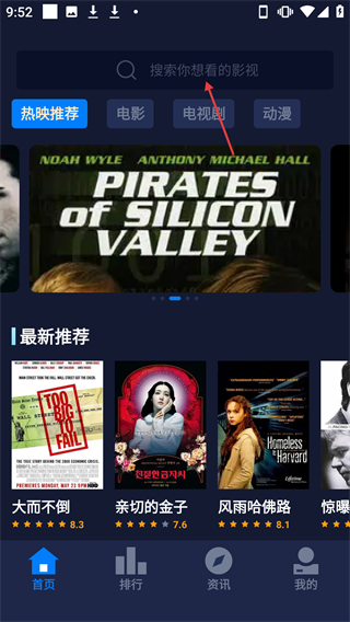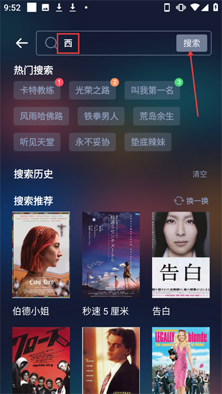1、在影視平臺首頁點擊頂部的搜索框,即可進入搜索頁面。