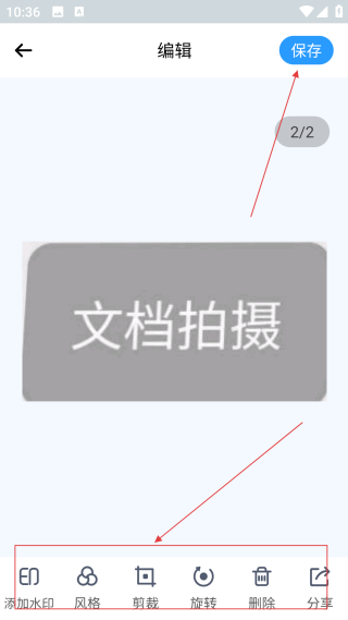 4、在編輯頁使用【添加水印】等功能,完成后點擊【保存】即可完成操作。