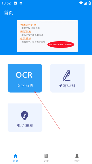 1、在首頁,點擊【OCR文字掃描】按鈕,進入對應的掃描操作界面。