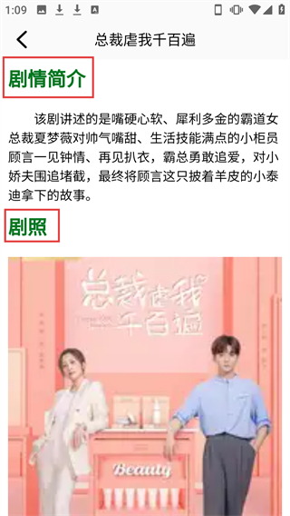4、在《總裁虐我千百遍》的詳情頁面,可查看【劇情簡介】與【劇照】等相關內容。