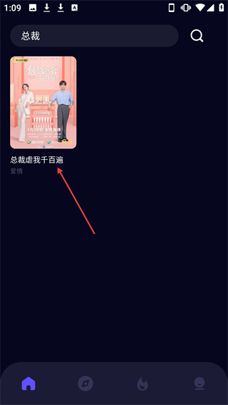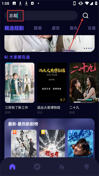 1、在首頁搜索框輸入【總裁】后,點擊右上角的搜索按鈕,可觸發搜索操作。
