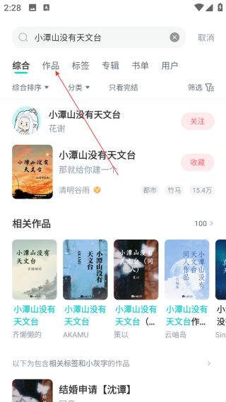 3、在搜索結果頁,點擊【作品】標簽,切換至作品類別的展示界面。