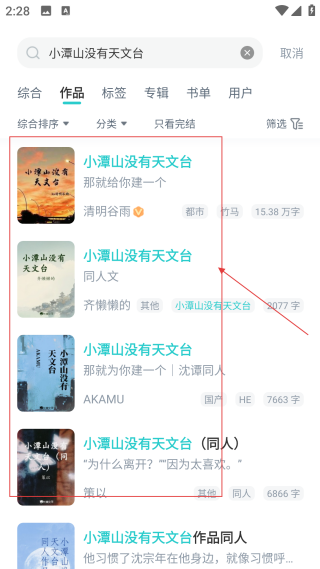 4、在作品列表中【選擇目標作品】,即可完成小說搜索操作。