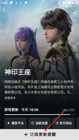 4、在《神印王座》的詳情頁面點擊【訂閱更新提醒】按鈕,可開啟該作品的更新提醒。