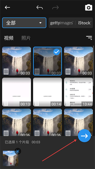 3、在素材選擇頁面選定目標片段后,點擊右下角的箭頭按鈕,即可進入后續的編輯環節。