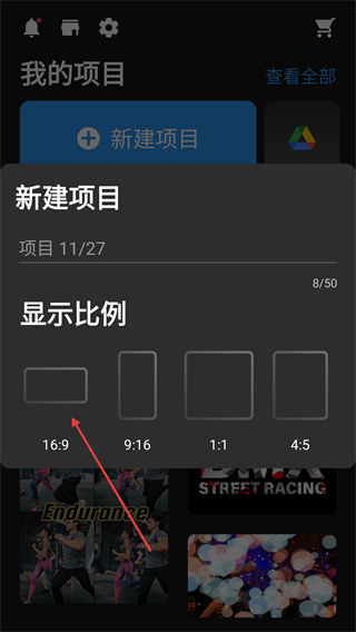 2、點擊【新建項目】后,在彈出的界面中選擇【顯示比例】對應的選項(如16:9),完成項目顯示比例的設置。