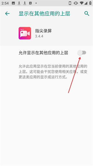 4、在【顯示在其他應(yīng)用的上層】設(shè)置頁,打開對應(yīng)的開關(guān),完成懸浮窗權(quán)限的開啟,以正常使用錄屏功能。