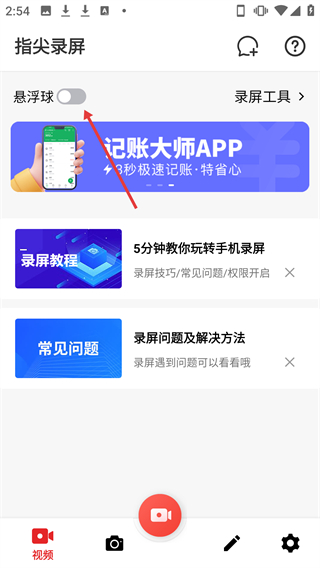 2、進入指尖錄屏主界面后,點擊【懸浮球】對應(yīng)的開關(guān),啟用懸浮球功能。