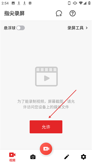 1、在【指尖錄屏】初始頁面,點擊【允許】按鈕,授予應(yīng)用訪問設(shè)備媒體文件的權(quán)限。