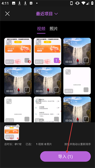 2、在【最近項目】的素材列表中選定目標視頻后,點擊【導入(1)】按鈕,進入視頻編輯界面。
