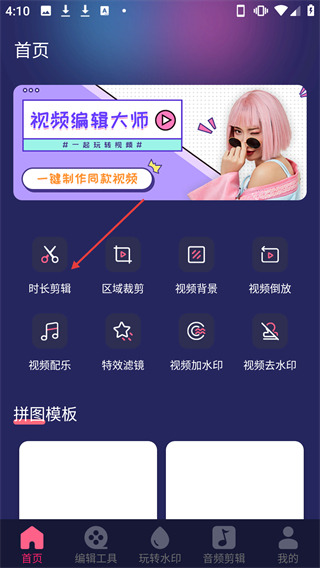 1、在首頁的功能板塊中,點擊【時長剪輯】選項,進入素材選擇頁面。