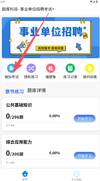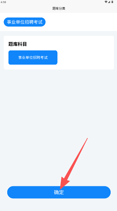 1、在首頁題庫科目區選擇事業單位招聘考試點擊“確認”進入選擇。
