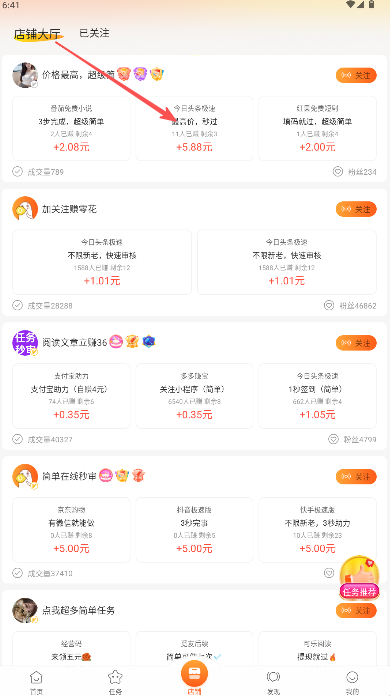 1、在“店鋪大廳”瀏覽已關(guān)注店鋪的任務(wù)卡片查看可賺金額與參與人數(shù)。