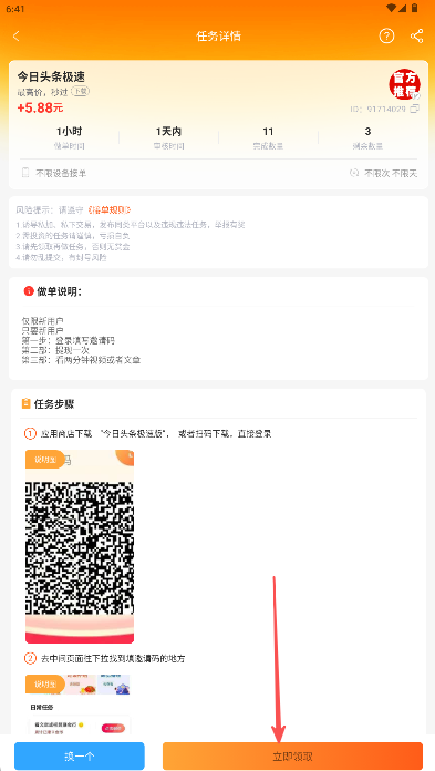 3、按任務(wù)步驟操作后選擇“立即領(lǐng)取”完成賺取流程。