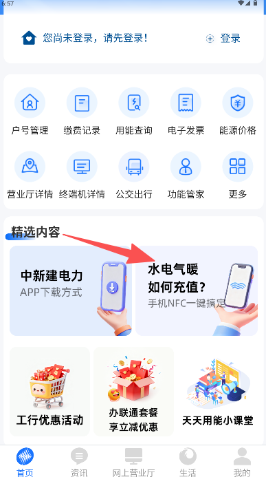 1、在首頁選擇“水電氣暖如何充值”按鈕進入頁面。