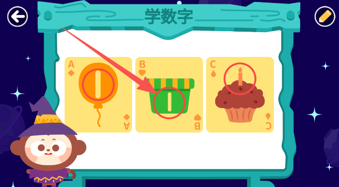 1、在“學數字”頁面選擇學習數字1與對應物品的關聯認知。