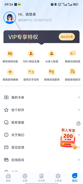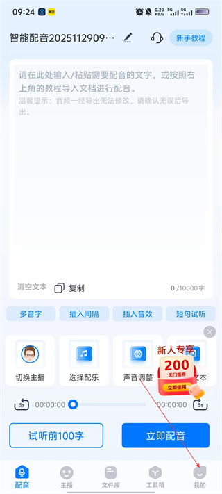 1、進入【智能配音】界面后,可在輸入框粘貼文字,用【切換主播】【選擇配樂】等功能調整,點擊我的進入個人界面。