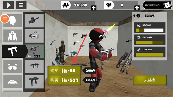 4、進入裝備界面,消耗資源【購買】武器,可選擇合適裝備提升【火柴人】戰斗能力。