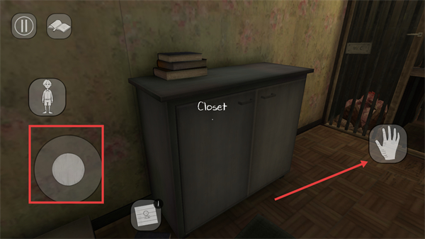 2、初始場景中,通過左側虛擬搖桿控制移動,優先點擊“Closet(衣柜)”交互,衣柜通常是隱藏道具或躲避修女的掩體。