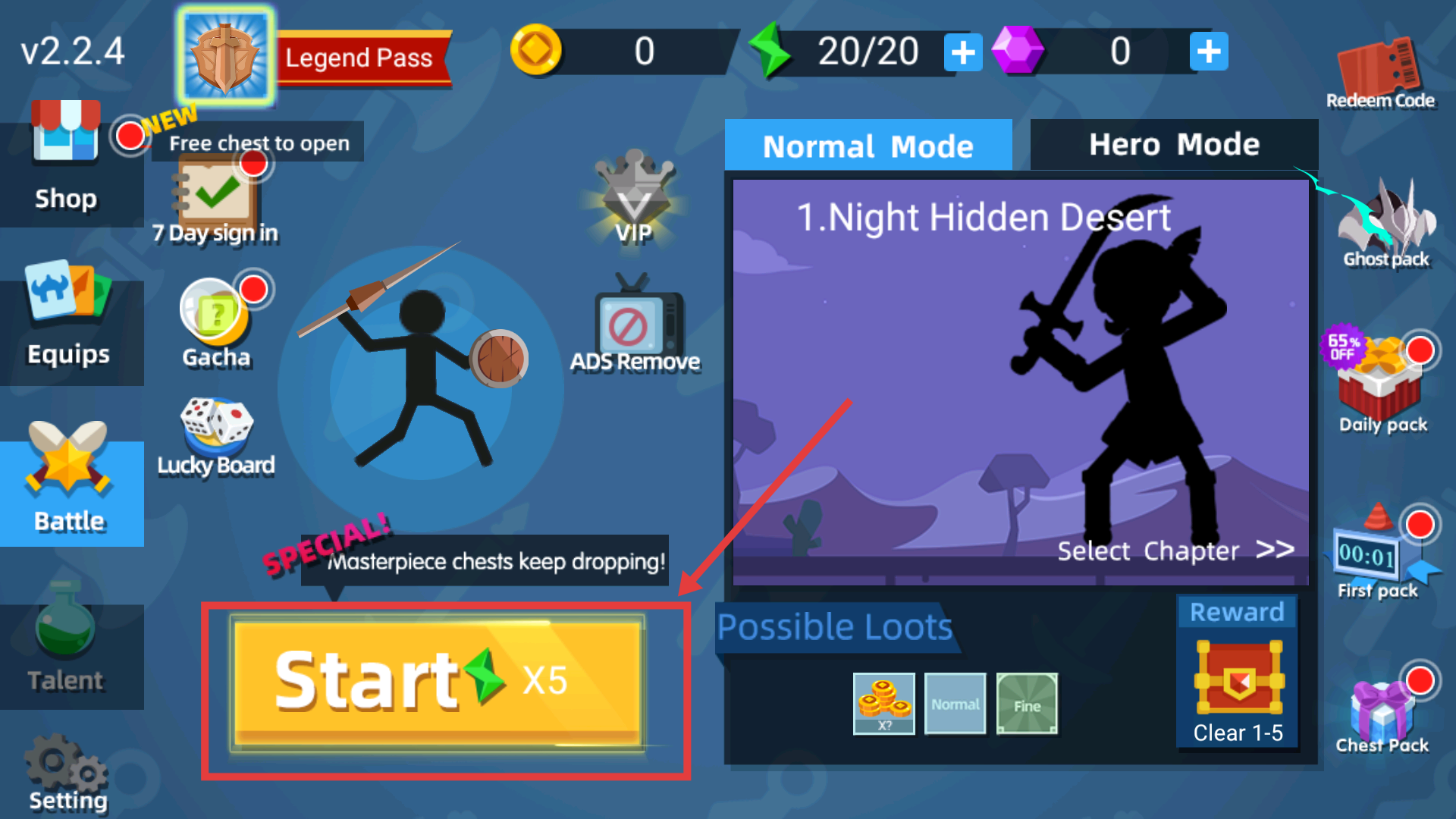 1、進入游戲主界面后,點擊【Start】消耗【5】個綠色寶石,選擇【NormalMode】下的【NightHiddenDesert】關卡開始挑戰。