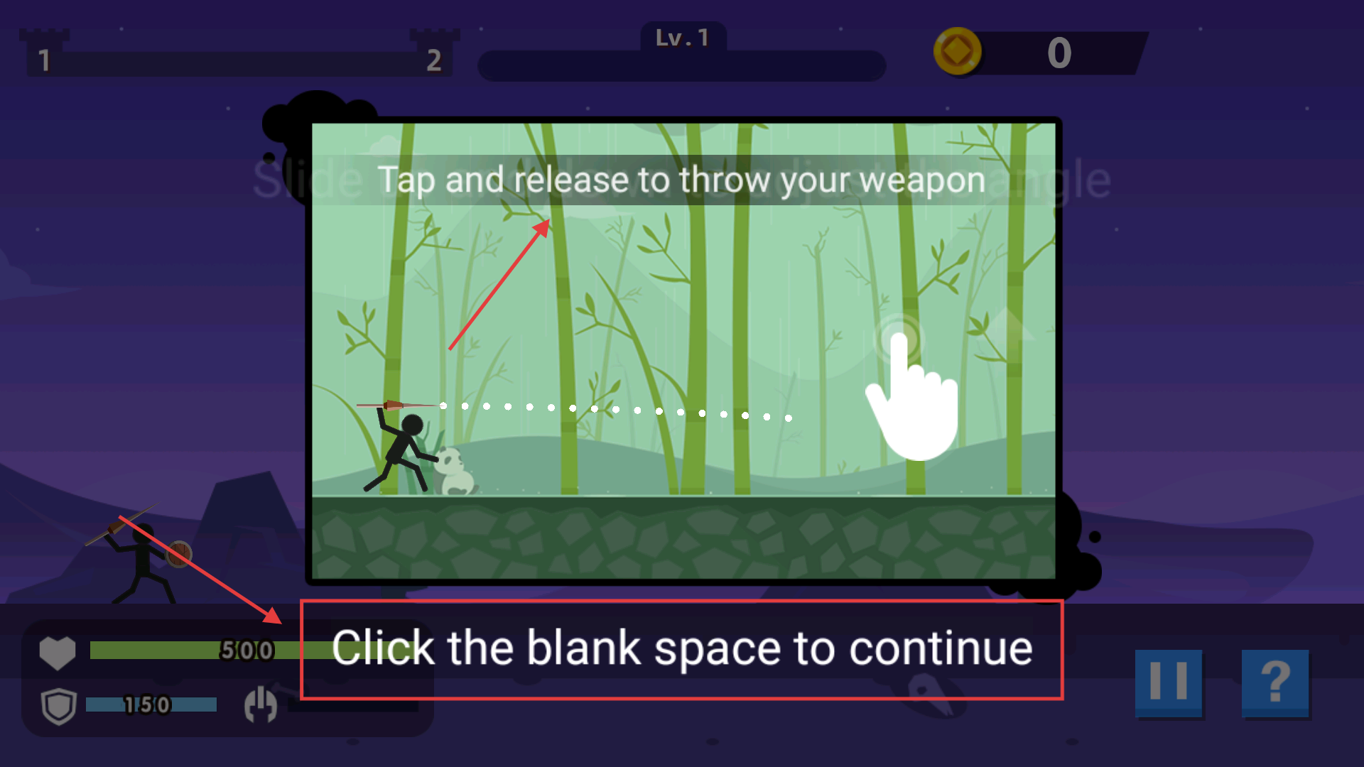 2、新手教程中,跟隨提示點擊空白區域繼續引導,學習【Tapandrelease】的操作方式來投出武器完成基礎射擊。