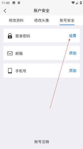 4、在賬戶安全頁,點擊登錄密碼右側的【設置】,即可進入界面修改密碼。