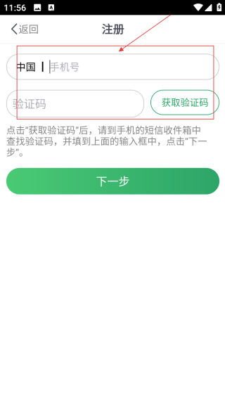 3、在注冊頁,填寫【手機號】后,點擊【獲取驗證碼填寫】,準備登錄。