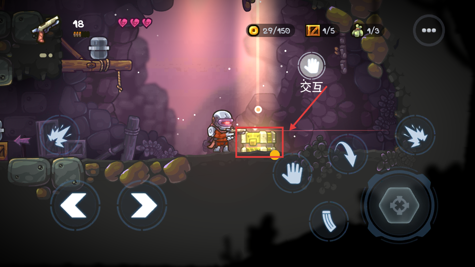 1、靠近洞穴中的黃色寶箱,觸發交互動作獲取資源,提升生存所需的物資儲備和戰斗能力。