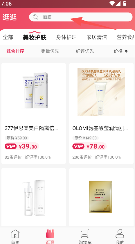 1、分類體系清晰明確,設(shè)美妝護膚身體護理等分類,搭配綜合銷量等排序方式,便于快速篩選商品,適配不同購物場景的商品查找需求。