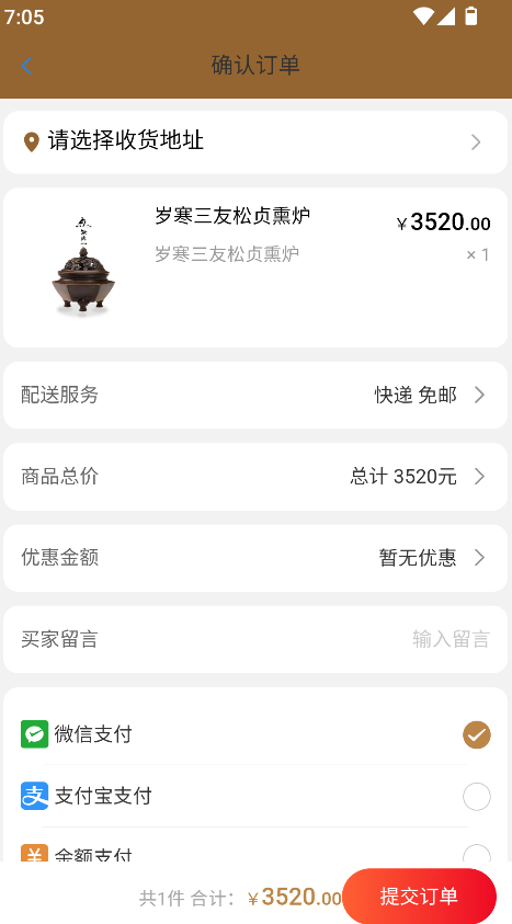 3、確認訂單頁信息整合完善,收貨地址選擇與支付方式等功能集中呈現(xiàn),便于統(tǒng)一確認訂單細節(jié),提升交易流程的高效性。