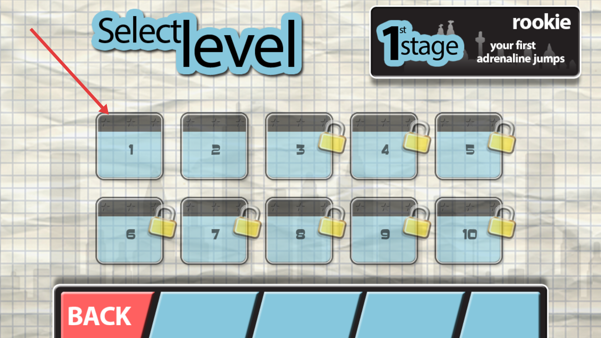 1、進入關卡選擇界面,當前僅解鎖1、2關,選擇關卡1開始挑戰,后續關卡需完成前置關卡解鎖,核心玩法為控制跳傘落點。