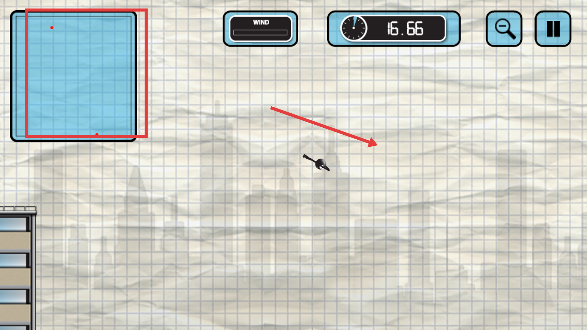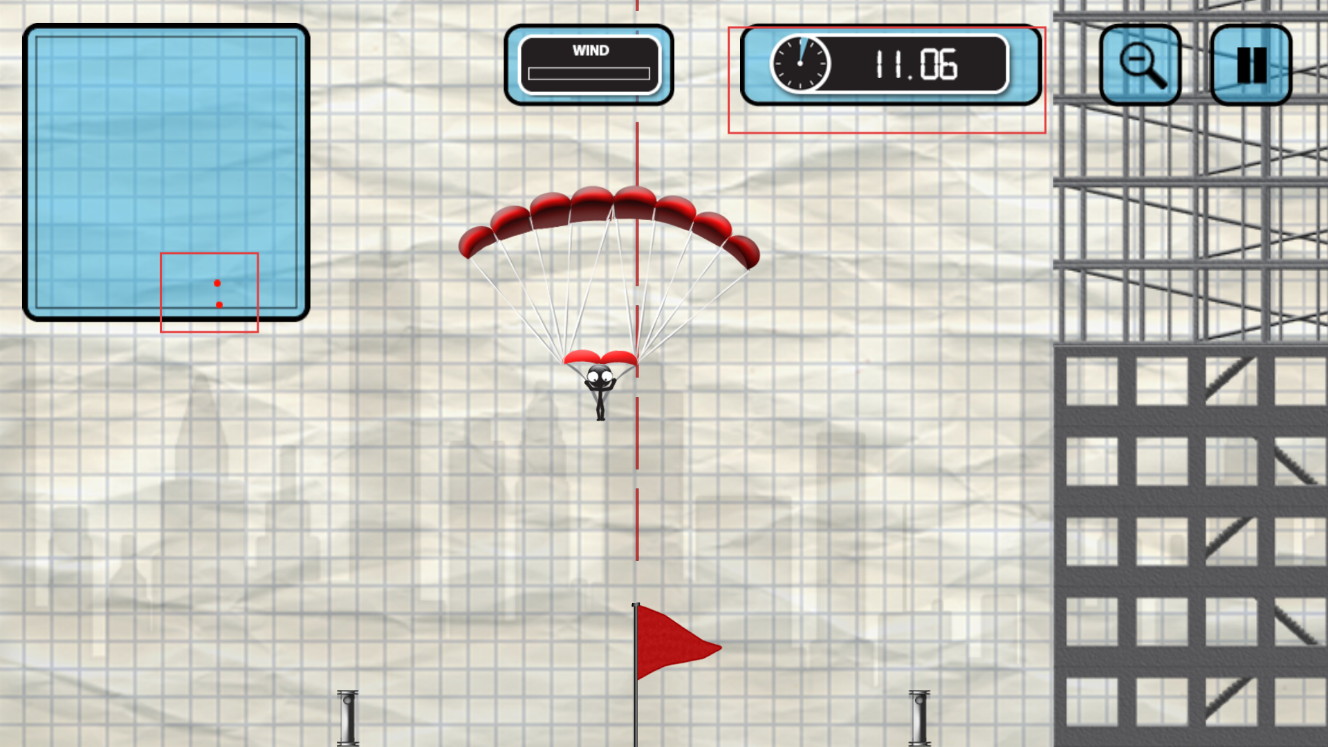 2、關卡中需觀察【WIND】風力與倒計時,控制跳傘角色的移動方向,目標是讓角色落在指定區域,風力會影響移動軌跡。