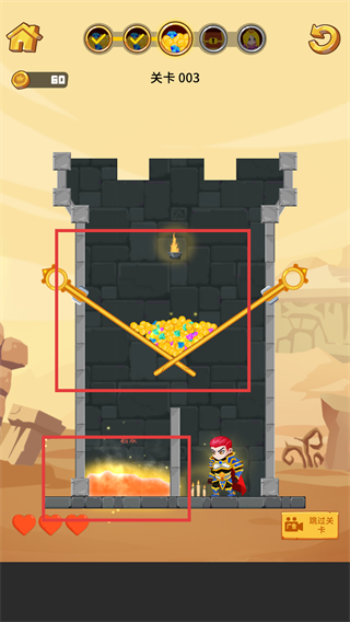 1、關卡003中,寶箱位于交叉時針機關上,下方有火焰陷阱,需調整機關角度,讓寶箱避開陷阱并滑向角色區域。