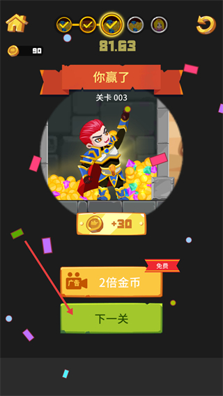 4、通關后獲得+30金幣獎勵,點擊【下一關】進入后續挑戰,也可觀看廣告獲取2倍金幣,積累資源解鎖更多關卡。