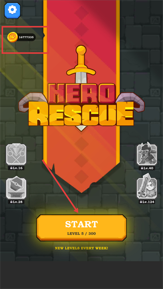 1、進入游戲主界面,點擊【START】進入關卡004,當前金幣數量充足,可利用資源解鎖道具輔助通關。
