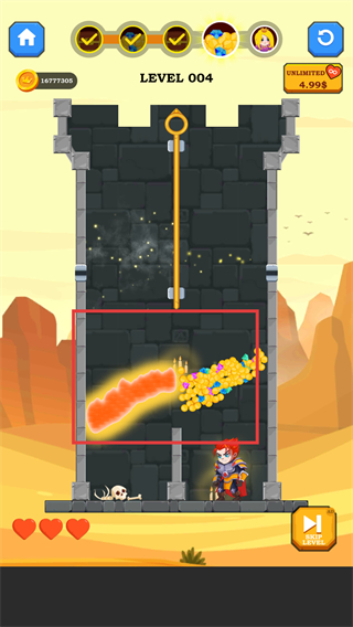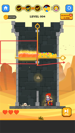 英雄救援無限金幣版是一款集智慧與冒險于一體的奇幻解謎手游,以“拯救公主+奪取寶藏”為核心主線,解鎖無限金幣福利,讓玩家在數千個精心設計的關卡中暢享無壓力解謎樂趣。玩家將化身勇敢英雄,通過拉動銷釘規劃安全路徑,消滅蜘蛛、破解復雜機關,憑借邏輯思維與策略能力克服重重障礙,簡單易上手的操作搭配極具挑戰性的謎題設計,帶來腦力與勇氣的雙重試煉。