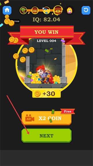 4、通關后獲得+30金幣獎勵,點擊【NEXT】進入下一關,也可觀看廣告獲取2倍金幣,積累資源提升通關效率。