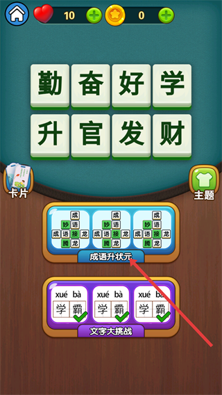 2、進(jìn)入功能選擇界面后,點(diǎn)擊【成語(yǔ)升狀元】按鈕,進(jìn)入具體的成語(yǔ)連線關(guān)卡,開始進(jìn)行文字組合的游戲操作。