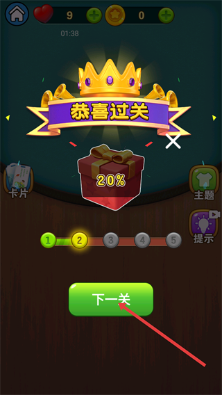 4、通關(guān)當(dāng)前關(guān)卡后,點(diǎn)擊界面中的【下一關(guān)】按鈕,進(jìn)入下一個(gè)成語(yǔ)連線關(guān)卡,繼續(xù)進(jìn)行游戲挑戰(zhàn)。