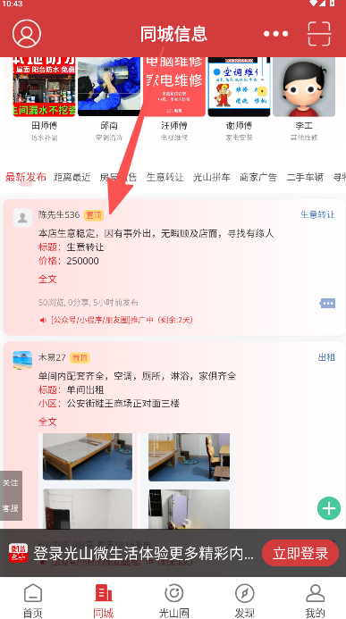2、在“同城信息”瀏覽生意轉(zhuǎn)讓、房屋租售等分類信息。