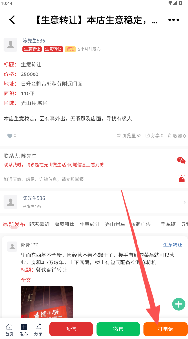 3、選擇“生意轉(zhuǎn)讓”在詳情頁點擊“打電話”直接聯(lián)系發(fā)布者溝通。