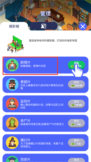 1、進入游戲后先選擇【劇情片】攝影棚類型,點擊【建造】按鈕消耗【10K】資金,開啟電影拍攝的第一步。