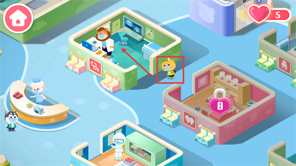 1、進入場景后,跟隨箭頭指引將【戴口罩的小貓】引導至【醫生所在區域】,開啟該角色的診療相關流程。