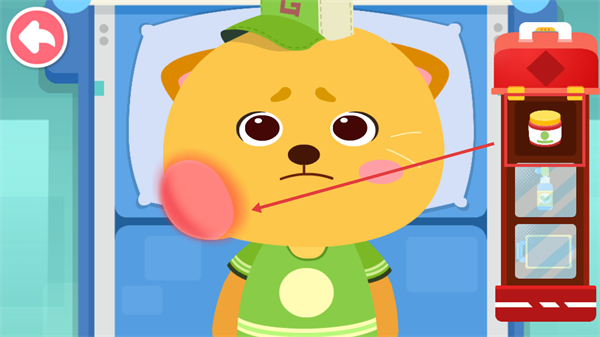 2、觀察到【小貓紅腫的臉頰】,跟隨箭頭指引選取右側柜內的對應物品,用其處理小貓的不適,推進當前診療步驟。