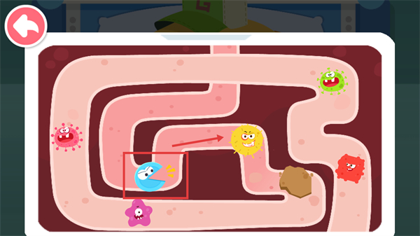 3、進入體內場景后,操控【藍色道具】按箭頭指引,對【黃色病毒】執行操作,清除該病毒以助力身體恢復。