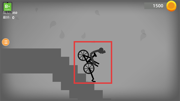 3、火柴人騎行至樓梯區域,紅框內顯示其摔倒動作,此時【得分-350】,持續積累游戲內的分數。